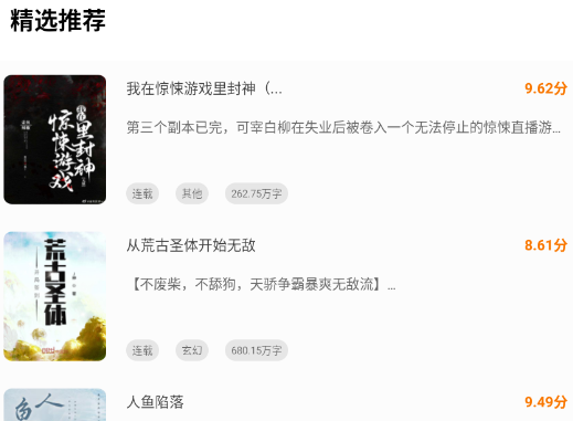 2.正版小说题材齐备,优选男频女频完成受欢迎,一应俱全。