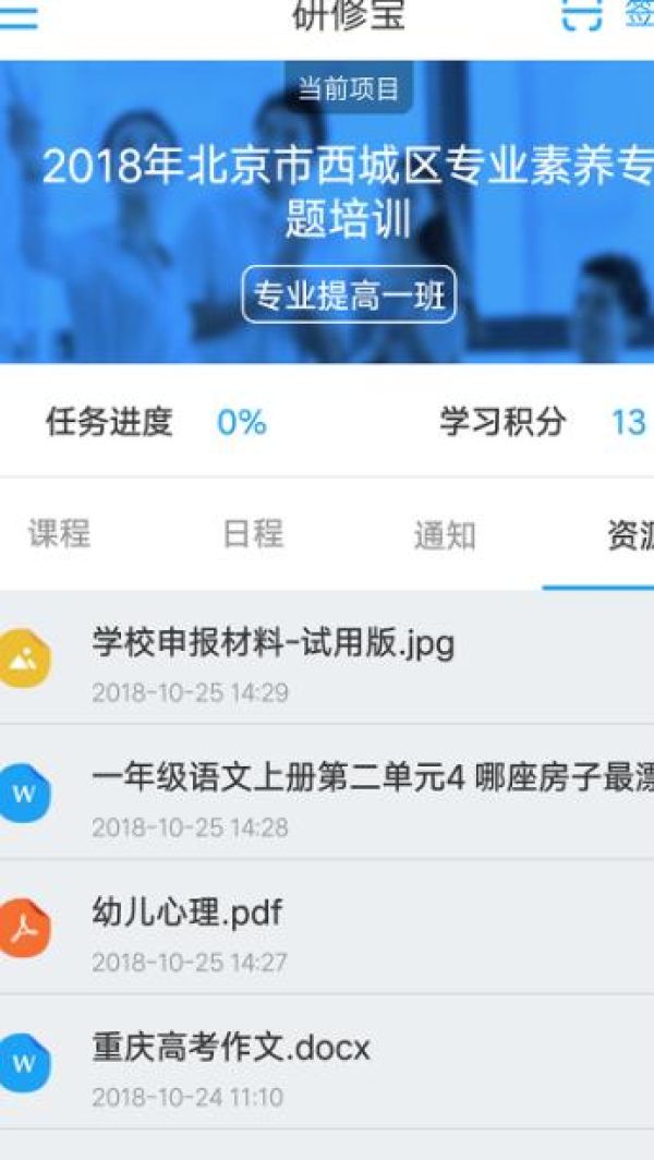 2.下载软件后可以查看研修指导、学习进度、查找资源、完成学习内容。