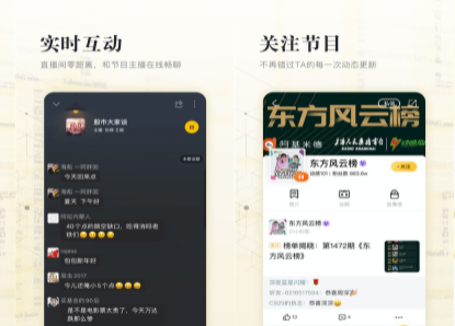 1、下载后,您可以关注您喜欢的节目、主播,进入专属直播间,与您喜欢的节目主播在线畅谈。