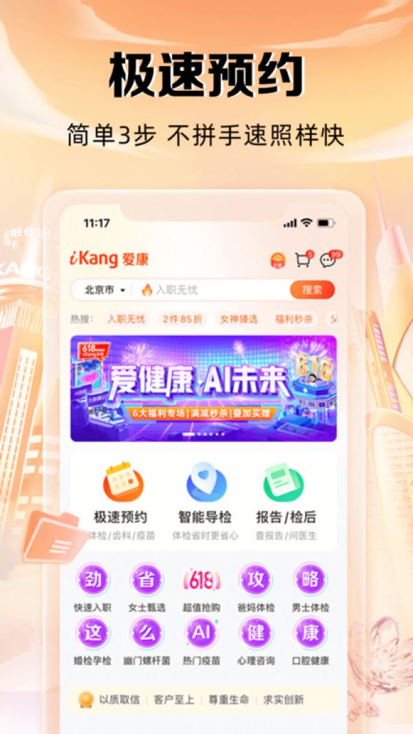 爱康是一款专业的体检报告查询软件。软件在拥有专业的健康医疗服务资源和先进技术支持的基础上,结合现代都市人群对日常就医和身体健康管理的需求,提供全面的健康体检、疾病检测等一系列健康管理服务。通过爱康软件,用户可以方便地通过手机预约个人就诊,也可以支持企业团体的预约,节省了很多等候的时间。需要就来下载吧!