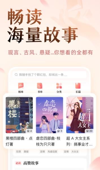 3.有言情、现实情感、悬疑、脑洞、科幻、武侠等分门别类的故事,给你更丰富的阅读体验。