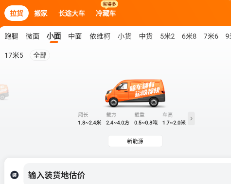 3.软件下载后根据货物的种类、体积等信息,选择适合的车型和车长,并填写发货和收货地址。