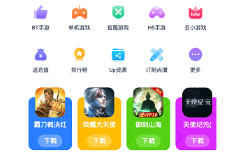 1、打开软件后,主页上有BT手机游戏、单机手机游戏、官方服务游戏、H5手机游戏、云游戏、游戏盲盒、折扣游戏、列表、UP资源、新产品快递,供用户寻找有趣的游戏。
