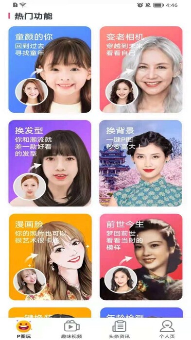 4.汇集了许多酷炫潮流AI相机功能,如变老、变年轻、换发型等。