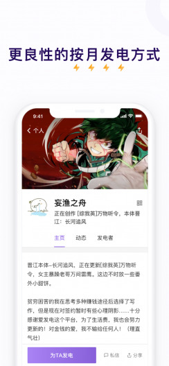 爱发电app是连接创作者和支持者的平台。非常适合各类创作者或独立艺术家,包括音乐家、小说家、漫画家、画家、软件开发者、播客和视频up主,vlog作者、生活评价、vtuber虚拟偶像、教程作者等。爱发电app为创作者和粉丝建立了一个交流平台,涵盖了广泛的范围。基本上,所有可以被视为创作者的用户都可以在这里发布他们的创作内容,不限制于内容形式,只需要做好内容分享即可,创作者可以通过粉丝的反馈给你带来更好的作品。