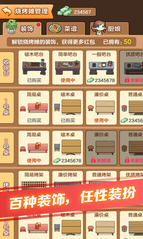 3.店铺管理,在一定程度上,更豪华的桌椅也可以增加收入,增加产品产量,让顾客吃烧烤更快也是游戏管理的关键。