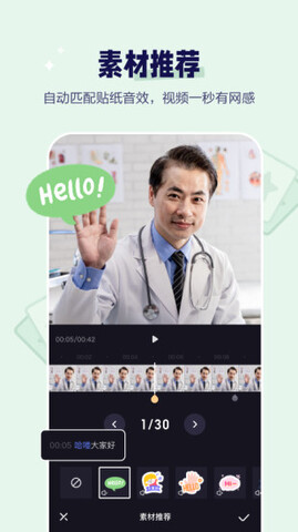 3.一键包装,标题字幕,贴纸花字一键完成,各种模板供您选择,还支持自定义调整材料哦。