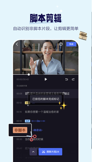 1.快速编辑,智能识别视频中的无声.重复和语气词等无效片段,一键清除。想要删除某个视频,只要删除相应的字幕片段,轻松粗剪。