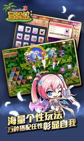 2.个性时装:海量时装:.精致.活泼.有趣的时尚道具尽收眼底!尽快在冒险岛手机游戏的世界里创造自己的个性角色。