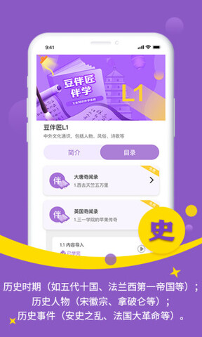 豆伴匠app是一个非常优质的手机端教育学习平台,又称豆伴匠伴学app,它拥有许多与文学和历史相关的知识点。文史内容包括:人、文、史、作四个版块,全面涵盖文史知识和读写技巧。通过轻松便捷的方式,可以随时随地进行自学、读写练测一体化,在趣味学习中完成通关任务,并且平台的教学素材都是免费分享的。豆伴匠app精选优质的课程资源,精英名师为您提供指导。软件还涵盖了中国当代世界的文学,让您了解更多的历史文学知识。
