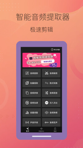 智能音频提取器是一款专业的音频智能提取软件,操作方法简单,可以帮助用户随时导入各种视频内容,提取和保存视频中的音频。此外,智能音频提取器还可以使用各种音频处理工具,包括音频切割、格式转换、拼接和混合功能,帮助用户制作自己的个性铃声,以及帮助用户随时导入各种视频内容,提取和保存视频中的音频,并且可以选择多种格式,使用方法简单。智能音频提取器提供强大的音频提取功能,视频中的音频快速智能提取,自带通用的音频编辑器,可以灵活准确地编辑出想要的效果,简单易用。