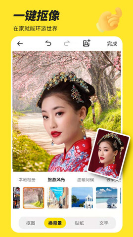 2.自动识别,一秒抠图,抠人,抠头,换背景,在家就能环游世界。