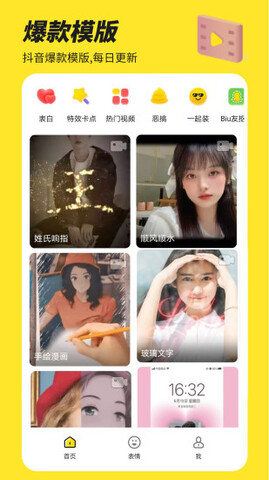 Biu神器app拥有超多的精品素材模板,用户可以免费试用超多模板,使用这些模板能够帮助用户一键生成各种热门视频大片,表白神图、恶搞图片、斗图表情、画中画等一系列的趣味十足的网络图片,而且还支持GIF动图和视频格式。Biu神器app为用户带来轻松的视频制作功能,你可以在其中找到自己需要的视频图片编辑功能,即使是新手也能制作出专属于自己的精美作品。并且抖音最火最潮的动画特效视频都可以一键轻轻松松转化。喜欢就快来下载吧!