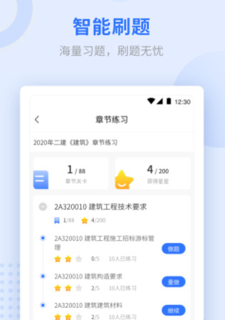3.智能题库,多年来真题、模拟题、章节练习答案分析、错题本、收藏夹支持消除错题。