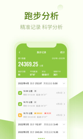 3.【记录跑步数据】软件将终身保存跑步轨迹、配速、步频、步幅、跑步距离等数据,并进行可视化数据统计分析。