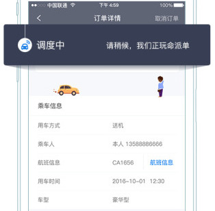 3、显示叫车订单,点击确定发送按钮,就会有专车来接你哟~