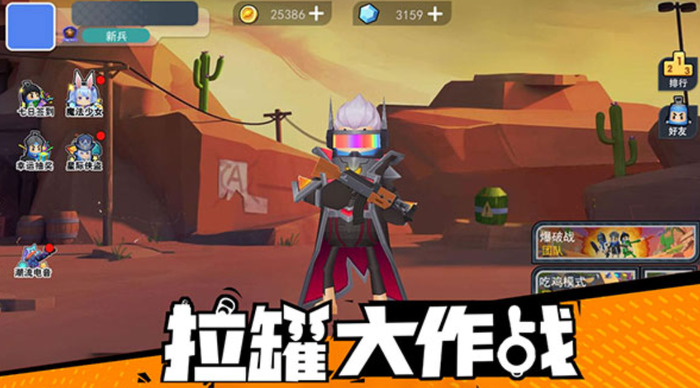 拉罐大作战是一款全新的动作射击吃鸡手机游戏,采用q版卡通风格设计,拥有精致美丽的游戏场景,全新可爱的角色形象,丰富多样的关卡挑战,刺激有趣的团体战斗,可以给你带来无限的乐趣。拉罐大作战为玩家准备了大量的武器装备,如手枪、冲锋枪、暴力枪、狙击枪、反弹枪、科技枪、火箭枪等你来体验!