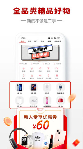 1.【全品类覆盖】手机、电脑平板、日用品、时尚品牌穿搭、美容钟表、母婴玩具、奢侈品等,可以在这里以更低的折扣购买,全平台自营,让你放心购买二手产品。