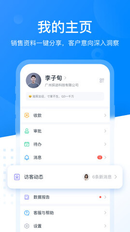 1.智能名片:通过销售与客户的日常互动链接,一键共享销售数据,快速传递产品价值;智能分析浏览轨迹,提前洞察客户意图。