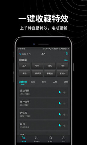 软件支持上百种云音效以及特效,蓝牙伴奏功能,真正的做到把声卡藏进麦克风里。