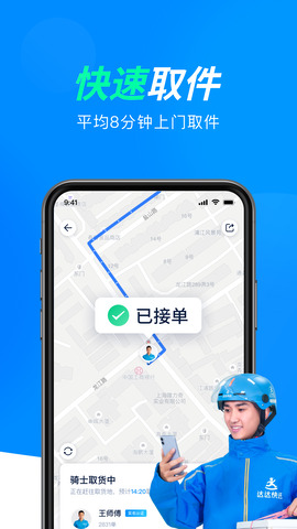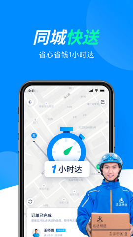 2.拥有一键式下单服务,快递员实现24小时快速取送货,可实现即时取货、同城送达。