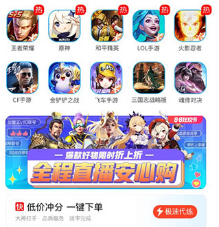 和平精英、王者荣耀、新笑傲江湖、闪烁之光、神雕侠侣2、球球大战等热门游戏道具折扣秒杀。