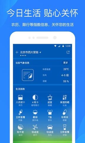3.提供分钟级降雨量预报,生活指数贴心关怀,农历、限行等指数信息,关怀您的生活。