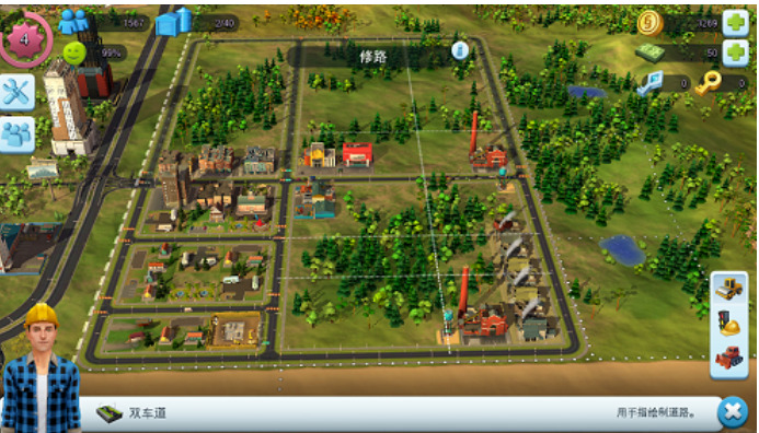 在游戏中,道路、住宅、服务设施和景观等建筑将占用土地资源。以最短的道路为参考,住宅面积为2X2。最高级别的消防局、派出所和医院占地面积为2X4。为了建造住宅或增加人口比例,可以节省更多的土地资源,避免过多的岔路口。这里可以参考的道路设计方法是用两条横向道路将住宅区划分开来,尽量不要建造纵向道路。