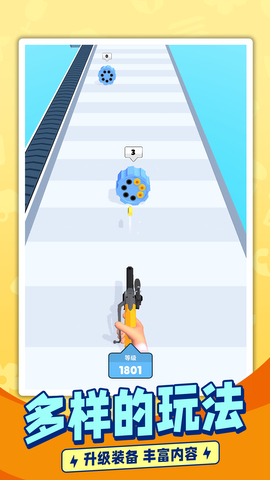 3、左右滑动可以控制枪支在轨道上前进,射击目标可以获得更多的钱,更容易取得突破。