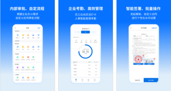 2、内部审批,自定程序:根据企业办公需要,管理员可以自定义设置财务报销、费用申请、入离转让等应用程序的审批程序。