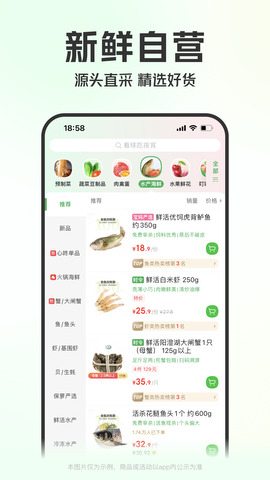 1.提供了多种类别的商品,包括新鲜蔬菜、水果、肉类、海鲜、乳品、粮油等。