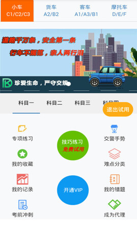 3.设置车型来备考A、B、C类驾照,学习科目一、科目四理论考试,及科目二、科目三路考考试。