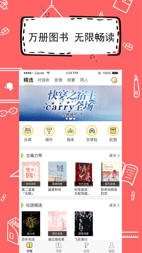 1.上万部原创小说,涵盖了言情、玄幻、都市、校园等多种类小说。