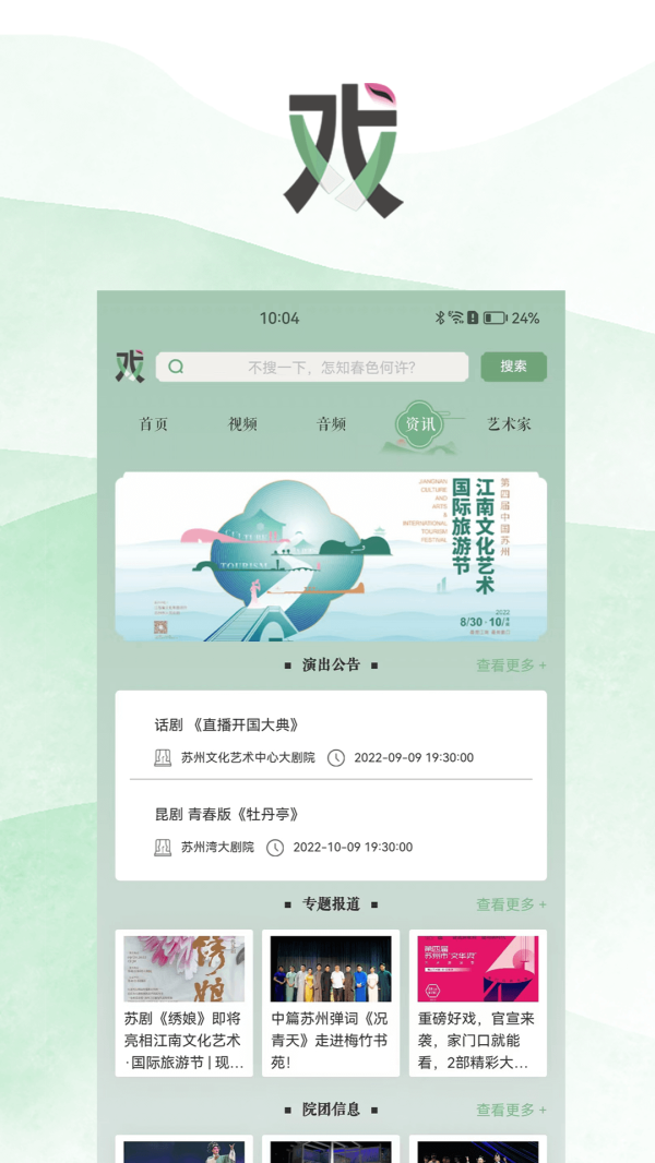 苏州有戏是一款提供丰富戏曲资源供用户观看的软件。软件收录了各种剧种的戏曲表演,分类清晰,内容全面,无论用户是想回忆过去的经典演出,还是想深入了解戏曲文化,都可以在这个软件中找到满意的选择。苏州有戏软件功能齐全,收录了丰富优质的戏曲内容,满足不同用户的需求。对戏曲感兴趣的用户,就快来点击下载体验吧!