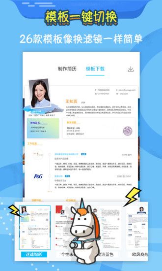 1、一键切换几十个简历模板,就像美图软件切换滤镜一样简单,自动生成完美的简历排版。