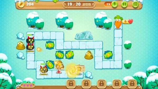 3、难度:游戏里的怪物来的时候,路是分叉的,也就是说,怪物可能会从两条路上吃萝卜,因此,同时攻击怪物更加困难。