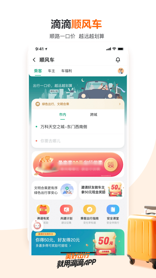 滴滴出行app最新版是一款方便、安全、多样化的出行平台,提供出租车、快车、顺风车、优享车、豪华车、网约车等多种出行服务。用户可以通过滴滴出行app最新版随时随地预约车,无需等待,同时,滴滴出行为用户提供了多种支付方式,包括现金支付、微信支付、支付宝支付等,满足了不同用户的支付需求。有需要的快来下载注册体验吧!