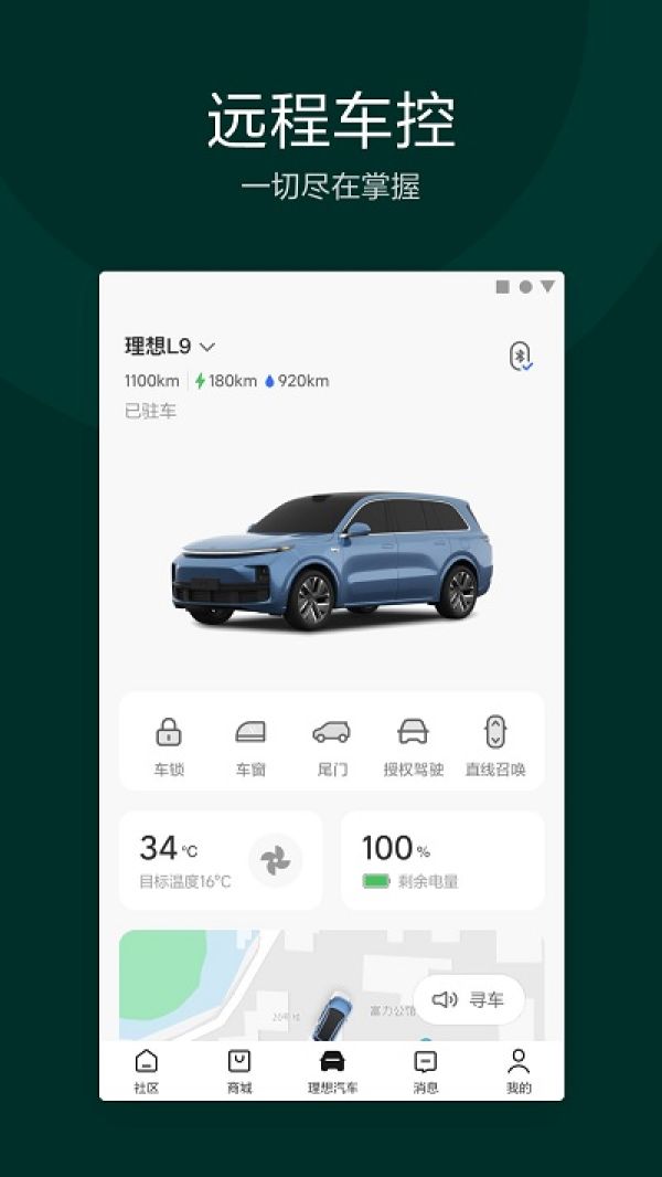 1.远程控制:车主可以通过理想汽车app远程控制车辆,如远程启动、关锁、开窗等功能,方便用户在任何时间、任何地点对车辆进行操作。