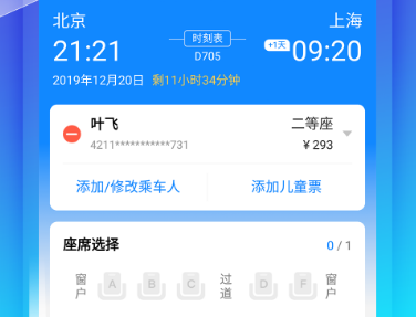 5.添加乘车人信息,选择座位等级,并提交订单。