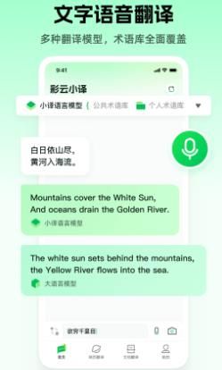 彩云小译是一款优质且免费的实时翻译软件,具备同声传译的功能,可以让用户在说话时,无需等待翻译,边说边译,持续不断地将用户的话翻译给对方,同时也支持文本、网页、拍照等翻译。彩云小译app还提供多种语种的翻译,包括中英、中日、中韩等,能够满足用户在不同场景下的翻译需求。有需要就来下载吧!
