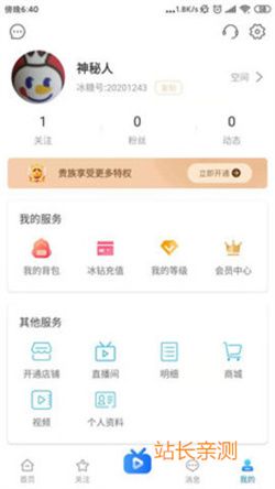 6、选择进入个人主页,查看所获粉丝数以及好友数,选择在线充值