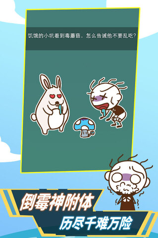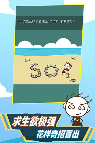 史小坑!活下去!游戏主要任务是要拯救主人公史小坑。故事是这样的,史小坑一开始落难到了荒岛上,在荒岛中的主人公史小坑不断的遇到各种倒霉搞笑的事情,每一关卡中史小坑都需要解决生存上的难题,缺水断粮、面临危险、遭遇野人等各种生存问题层出不穷,游戏的玩法就是以问答加操作的形式表现,帮助史小坑解决遇到的每一个问题。史小坑!活下去!游戏的每个关卡只有一个过关方式,关卡丰富,设计创新,百余个精心设计的关卡,一路奇葩障碍,让你猝不及防。