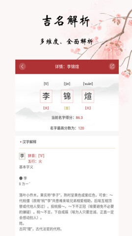 3.专业命名,专业大师解名,一键查询您的姓名拼音、笔画、五行、吉凶、分析字形意义,轻松分析名称。