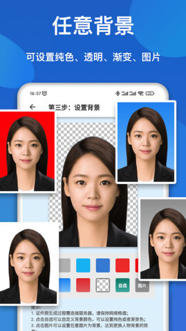 3.一键更换底色,可以任意设置照片底色,除了软件预置的常见证照底色(白、蓝、红、灰),您还可以设置任意的纯色、渐变或透明作为背景,甚至还可以设置任意图片,实现快速更换人物背景的目的。