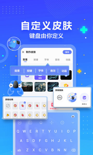 5.自定义皮肤:超多动画、按键、字体,更有盲打键盘DIY。
