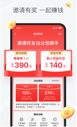 美团众包骑手app下载官方的这款软件是一款专为美团外卖配送员推出的在线接单软件,界面简洁,运行流畅。用户通过软件可以快速获取附近需要完成的订单,并在规定时间内完成任务即可获取酬劳,十分方便。而对于商家用户来说,美团众包骑手app下载官方的这款软件可以为你快速找到配送员给你送货,并且价格实惠,安全有保障。平台长期保持兼职专职骑手招聘活动,注册即可开始进行配送兼职工作,单单结算,让您随时随地开赚,自我掌控时间。