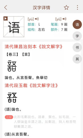 3.文字下方是清代陈昌治刻本说解字的文字注释原文,软件加入现代译文,一举两得。