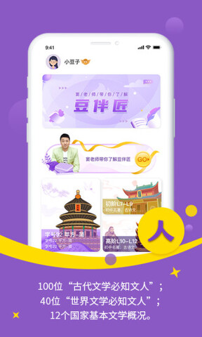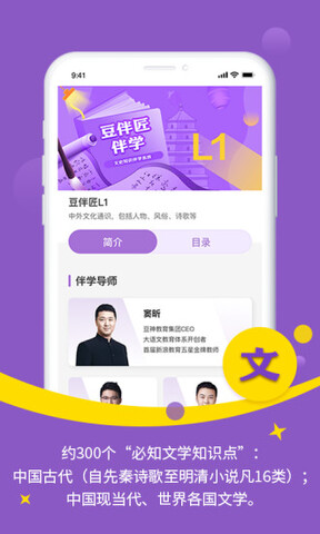 豆伴匠app是一个非常优质的手机端教育学习平台,又称豆伴匠伴学app,它拥有许多与文学和历史相关的知识点。文史内容包括:人、文、史、作四个版块,全面涵盖文史知识和读写技巧。通过轻松便捷的方式,可以随时随地进行自学、读写练测一体化,在趣味学习中完成通关任务,并且平台的教学素材都是免费分享的。豆伴匠app精选优质的课程资源,精英名师为您提供指导。软件还涵盖了中国当代世界的文学,让您了解更多的历史文学知识。