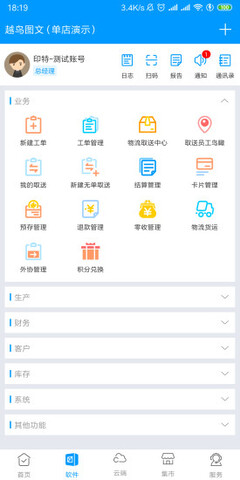 3.提供丰富的功能,拥有生产中心、销售中心、财务中心等,按分类展示。