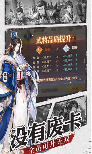 三国志幻想大陆游戏是以三国背景题材打造的二次元卡牌策略游戏,汇聚了国内一线的声优大咖倾情献声,不仅能够享受到视觉上所带来的冲击,还能享受听觉盛宴,沉浸式的精彩剧情故事,带你重回三国经典。多个武将一键切换,等阶装备也能一键转移,不需要重复养号,匠心还原三国名将人物的细节,带给你全新的三国战斗体验。三国志幻想大陆游戏突破传统卡牌的束缚,给你全将可用、零损养成的全新体验。用你的智慧不断冒险,击败可怕的敌人,获得最终的胜利,一统天下吧。